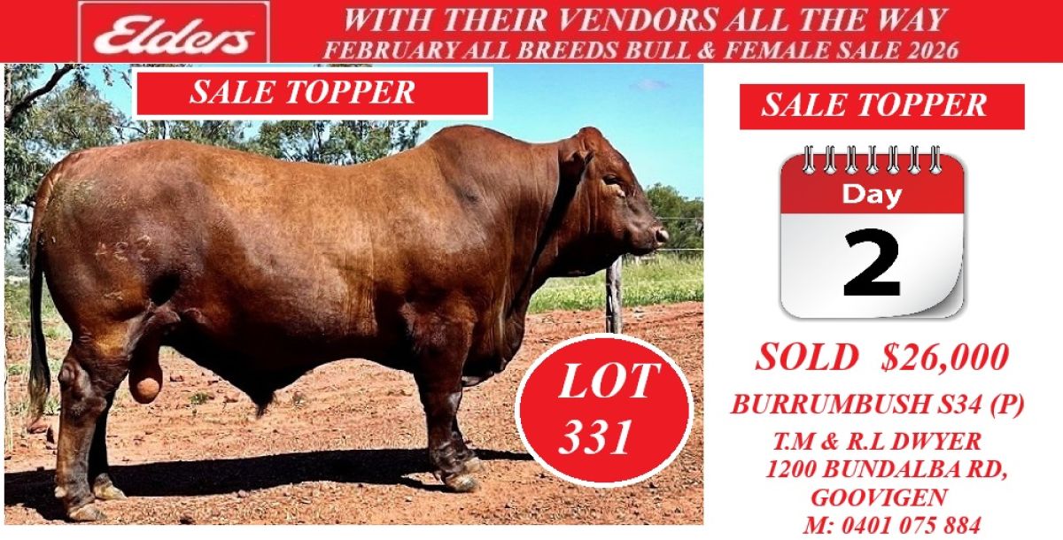 Avg $8,793 85% top $26,000 lot 331 (Red Brangus) A/c TM & RL Dwyer, Goovigen.
