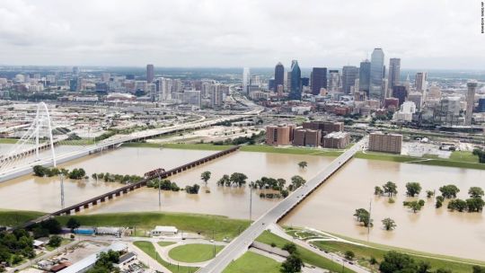 About 40 miles northeast of Houston, ranchers were using an air boat to corral and feed a herd of about 500 cattle after they became stranded by flooding Saturday along the Trinity River that turned their pasture into an island outside the city of Liberty.