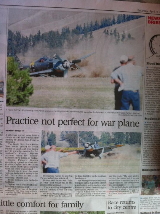 A follow up story about my blog on the Omaka Air Show story I posted on the 3rd of April, about 1 hour after we left the air show a plane had a crash landing see attached newspaper article, a good friend of mine let’s call him “Beach Whale” said to me by phone on the day of the air show, ‘you won’t get me at one of those shows because there is always a crash’, Nostradamus is alive and well and living in Beaudesert, thanks Terry.