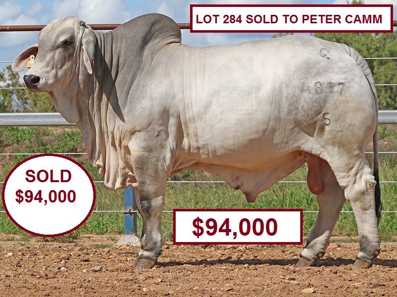 Lawson Camm very next bull in the ring Lot 285 sold for $66,000 to Brett Nobbs, Nobbs Cattle Co, and John Kirk, Carinya Brahmans.