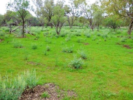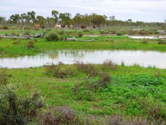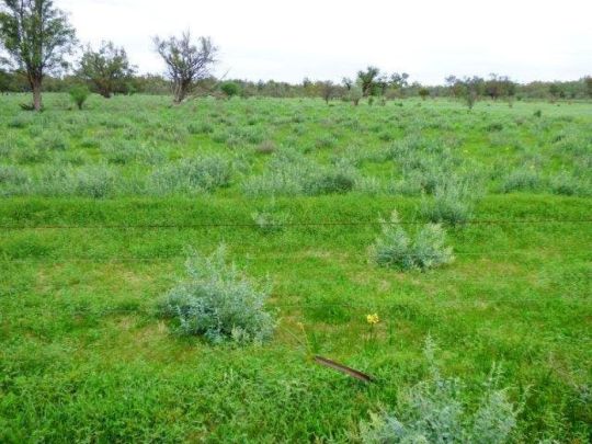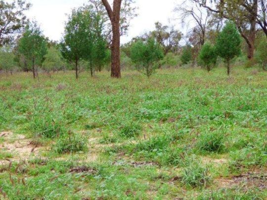 Mixture of country - Warrego River frontage with buffel grass, open Mitchell grass plain, soft red Mulga, Box, Sandalwood some buffel, abundance of low edible Mulga, some lakes and stony Mulga ridge.